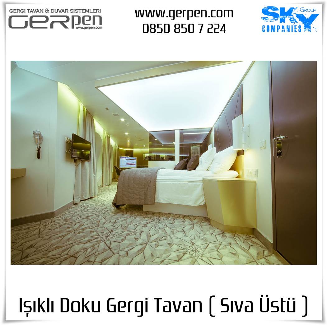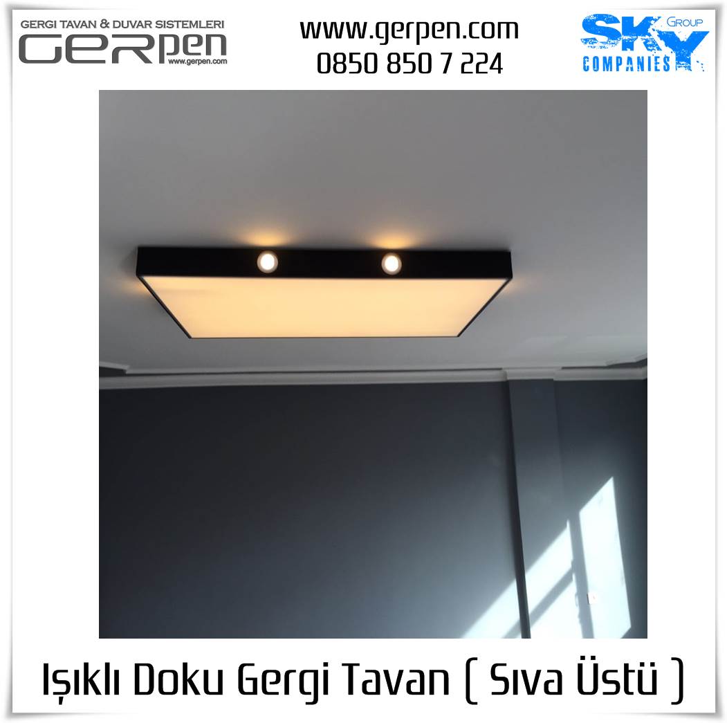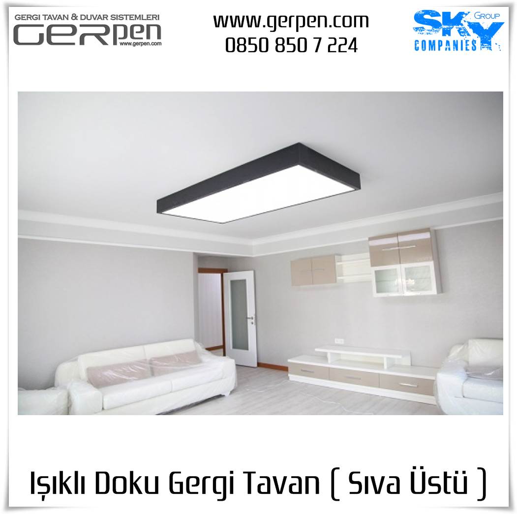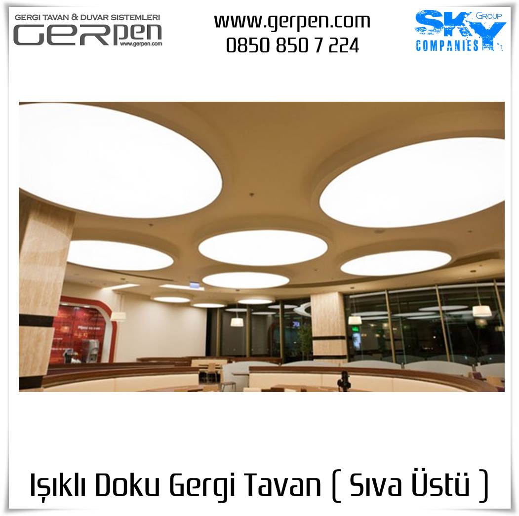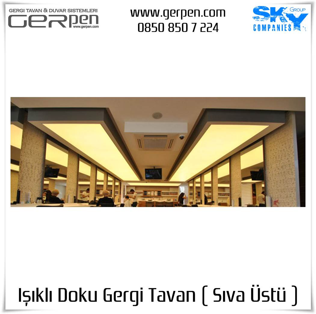 Işıklı Doku Gergi Tavan ( Sıva Üstü ); otel, hastane, ev, okul, iş yeri, lokanta, restaurant, cafe, kafeterya, çeşitli kamu kurumları ve daha bir çok alanda dekorasyon ve aydınlatma amaçlı kullanılabilir. Uygulama öncesi, sıva altı gergi tavan uygulaması gibi uygulanacak alanın alçı pan havuzunun hazır olmasına gerek yoktur. Sıva altı ( alçı pan / niş ) gergi tavan tercih eden müşterilerimiz sıva altı gergi tavan ürünlerimizi tercih edebilirler. Işıklı Doku Gergi Tavan fiyatları ve modelleri için bu sayfamız size eşlik edecektir.